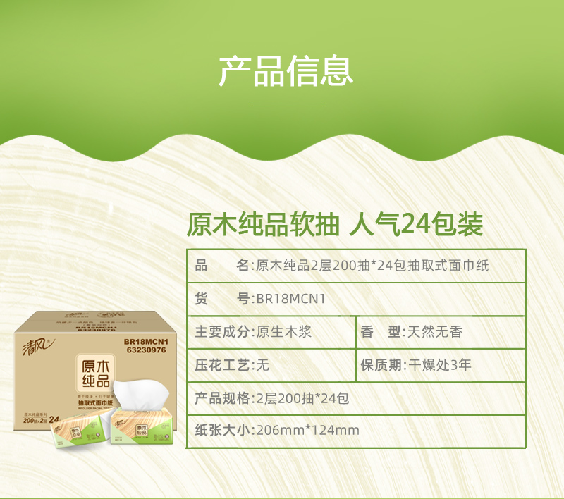 商品名称:清风原木抽纸2层200抽24包 BR18MCN1