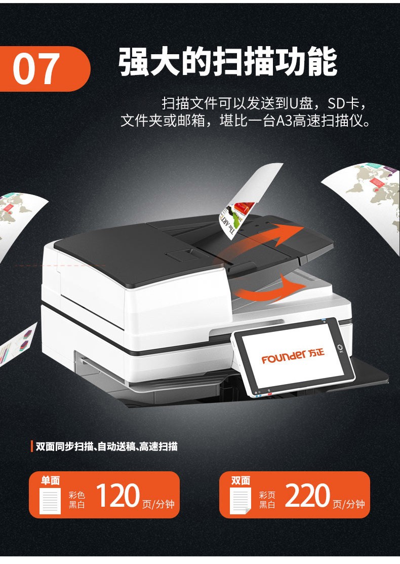 4.设备标配高速双面彩色扫描仪,扫描速度≥240页/分钟300dpi,纸张容量≥300张;