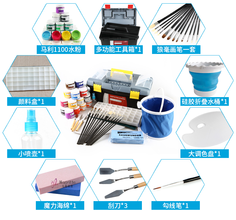 商品名称:马利水粉颜料套装100ml罐装12色学生用专业美术生专用画画初学者马丽色彩玛丽马力牌儿童水彩画工具全套